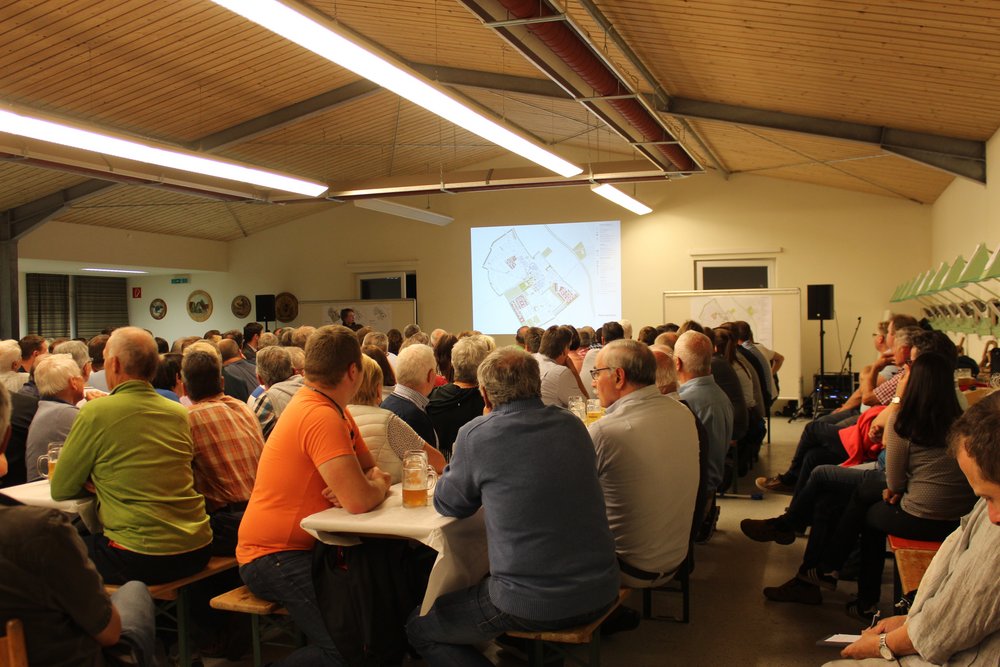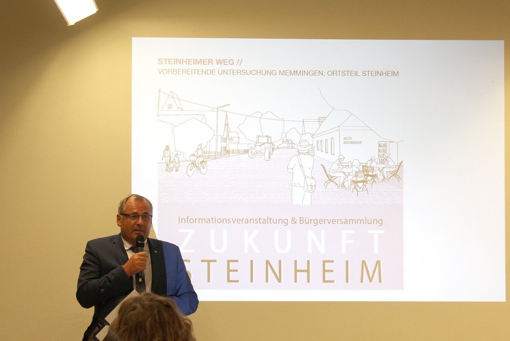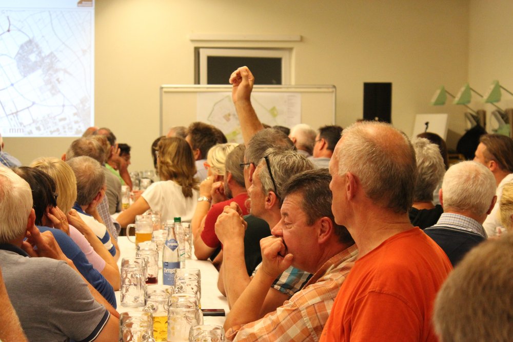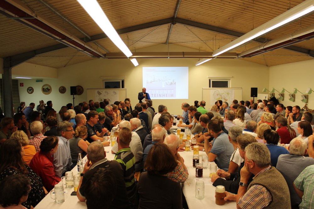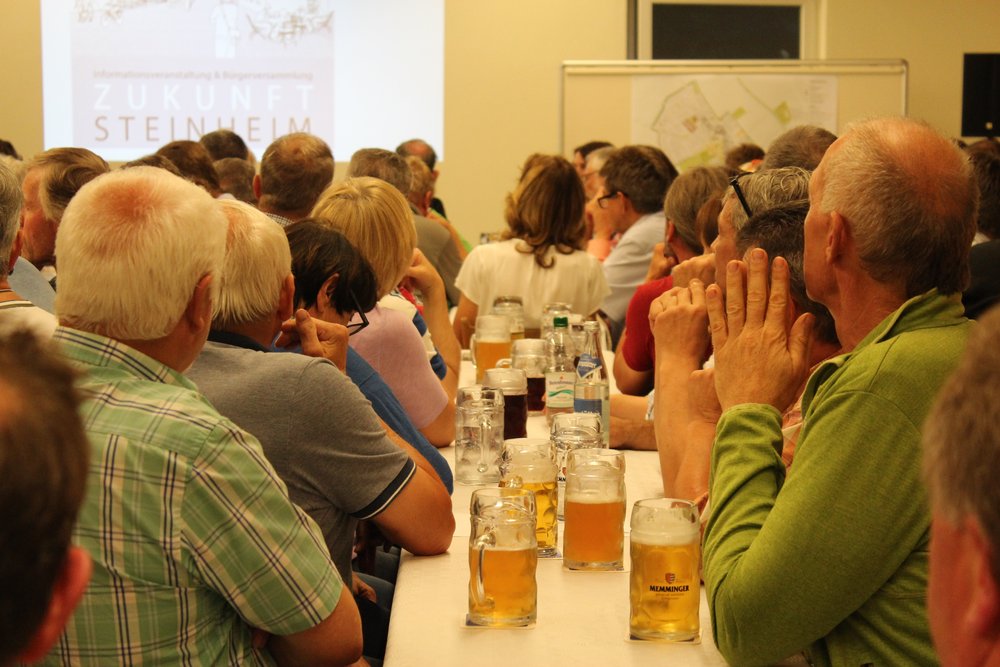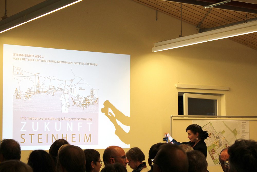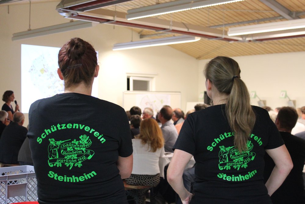 Über 200 Personen waren in die Steinheimer Schützenhalle gekommen. Dort fand unter Teilnahme des Oberbürgermeisters der Stadt Memmingen, Manfred Schilder, eine öffentliche Informationsveranstaltung zum Abschluss der zweiten Stufe der Vorbereitenden Untersuchungen statt - in Verbindung mit einer Bürgerversammlung des Bürgerausschusses. Die Vertreter*innen des Schützenvereins Steinheim trugen mit Raum und Bewirtung sehr zur guten Atmosphäre des Abends bei. Die Moderation übernahm Herr Prof. Rettich vom Team KARO*.