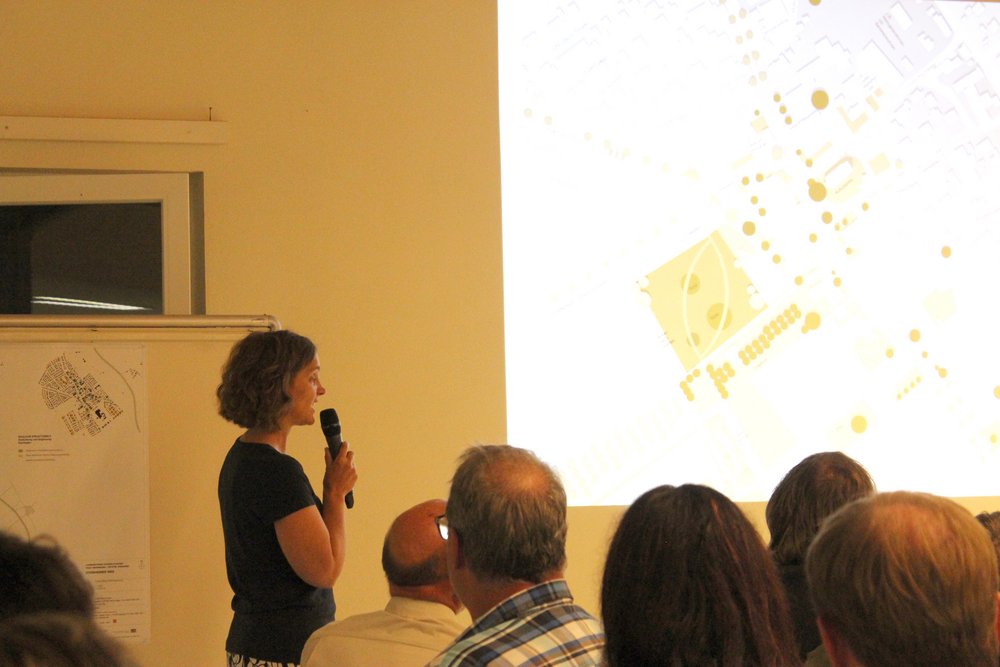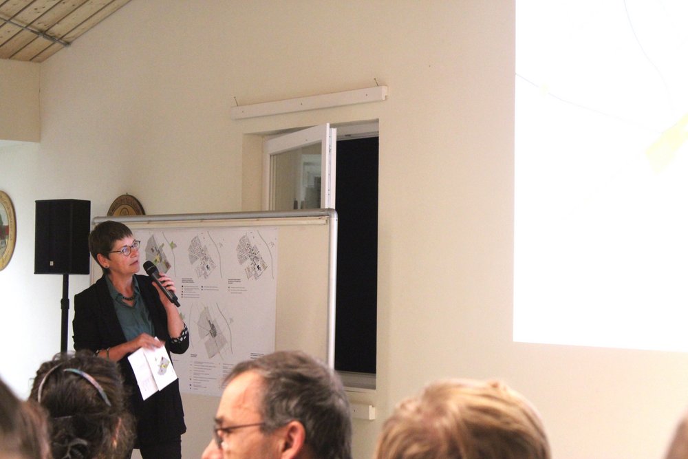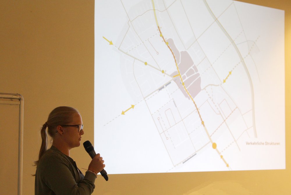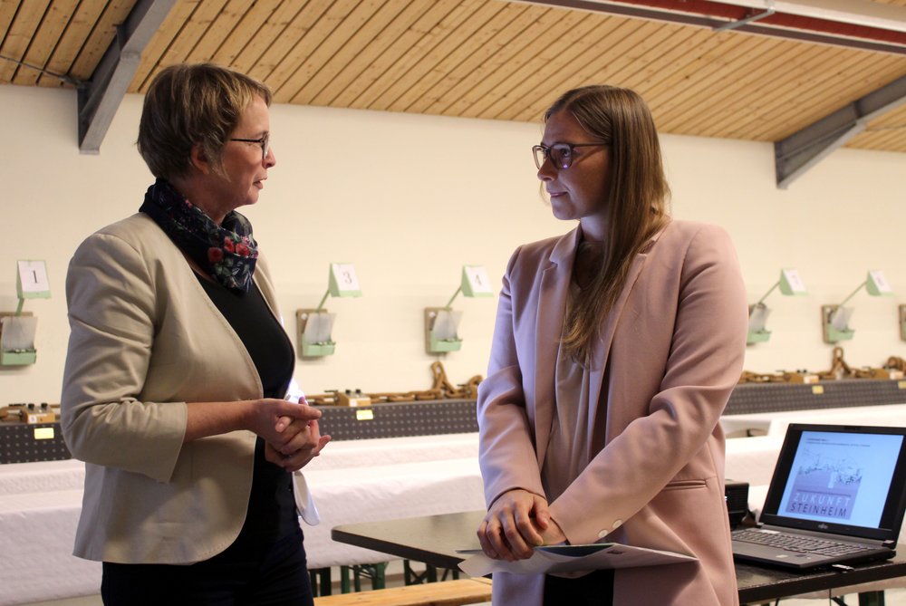 Im Namen des Planungsteams stellten Frau Heuer, Frau Rehsöft, Frau Dr. Seelemann und Frau Hofmann Konzepte und Ideen für den Ort vor. In der Schützenhalle waren parallel sämtliche Pläne der Stufe zwei ausgestellt. Auf dieser Grundlage diskutierten Steinheimer*innen, Vertreter*innen der städtischen Ämter und Planer*innen den Entwurf der Rahmenplanung.