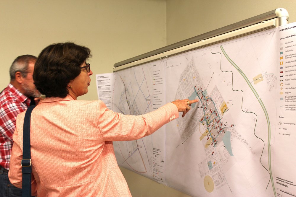 Das Planungsteam nahm Hinweise und Anregungen aus der Bürgerschaft auf. Hier ging es beispielsweise um geräuscharmen Straßenbelag im Ortszentrum, um notwendige Angebote für Jugendliche, um die Profilierung des geplanten Sportparks Steinheim (beispielsweise über eine Mountainbikestrecke), aber auch um die Ästhetik zentraler Gebäude.