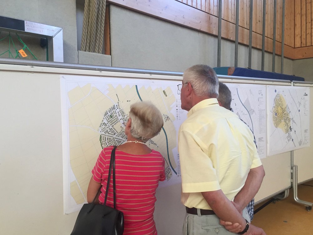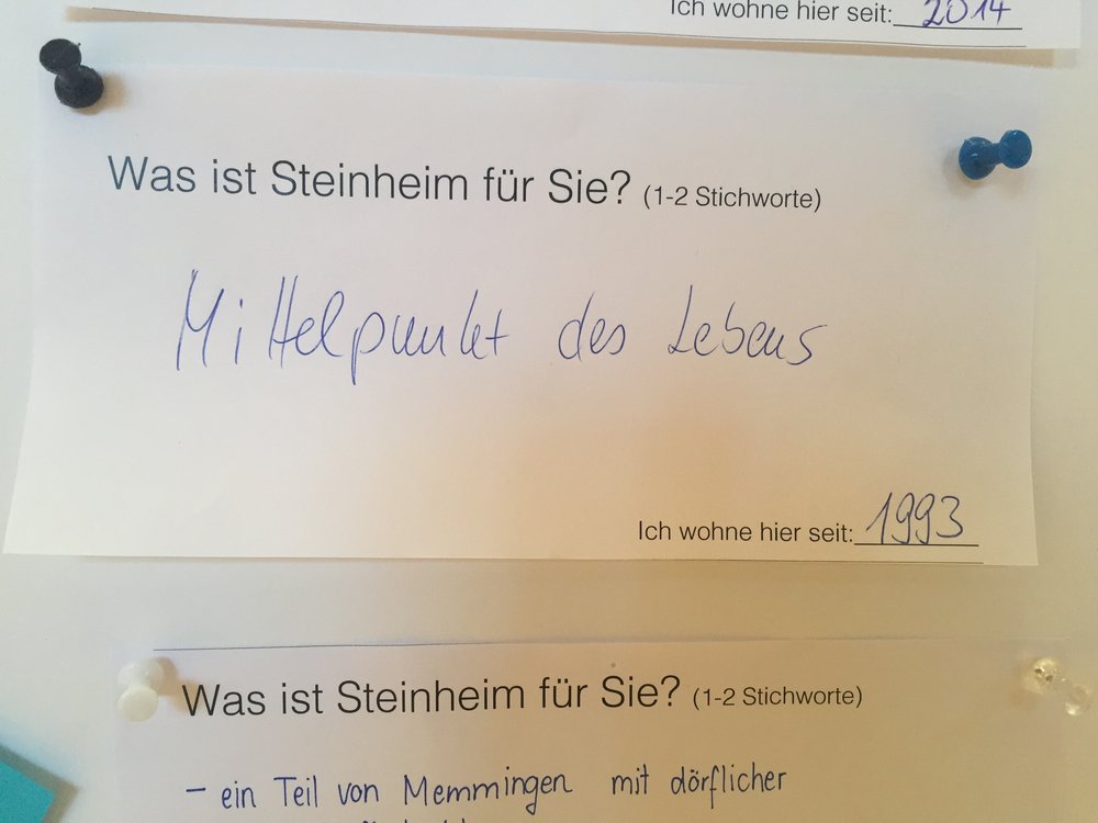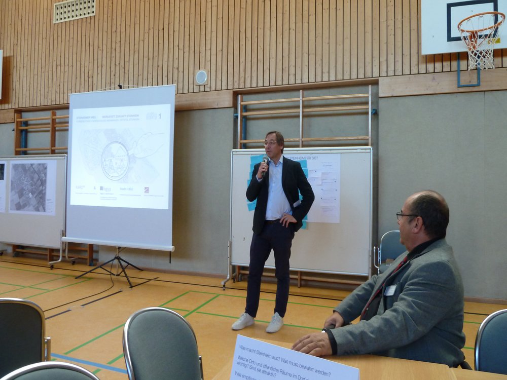 Etwa die Hälfte der Teilnehmenden hat eine Antwort notiert – der weit überwiegende Teil bezeichnete sich dabei als „alteingesessen“. Deutlich wurde, dass Steinheim in erster Linie als Synonym für Heimat steht. Steinheim wird als „Wohlfühlort“ und „Lebensmittelpunkt“ beschrieben – der dörfliche Charakter spielt eine wichtige Rolle. Wer zu dieser Bürgerwerkstatt gekommen ist, glaubt an den Ort: „Meine Heimat, meine Zukunft“ heißt es oder einfach “Do bee i dahoam, do möcht i gern bleiba“. Nach der Begrüßung durch den Oberbürgermeister Manfred Schilder präsentierte das Planerteam Analyseergebnisse und Thesen.