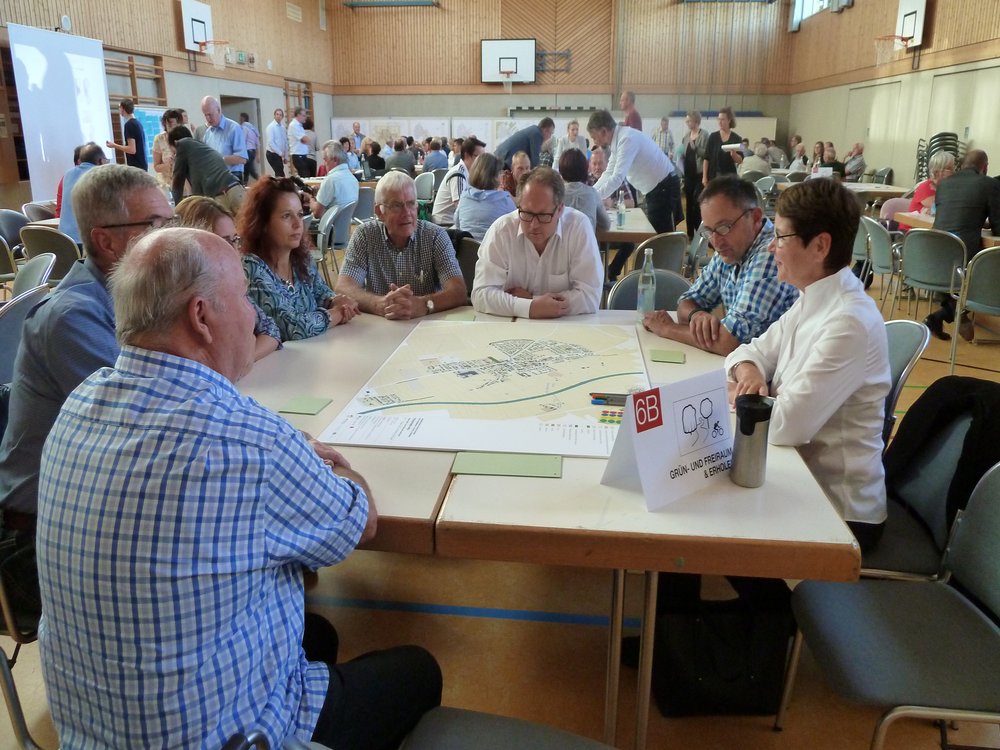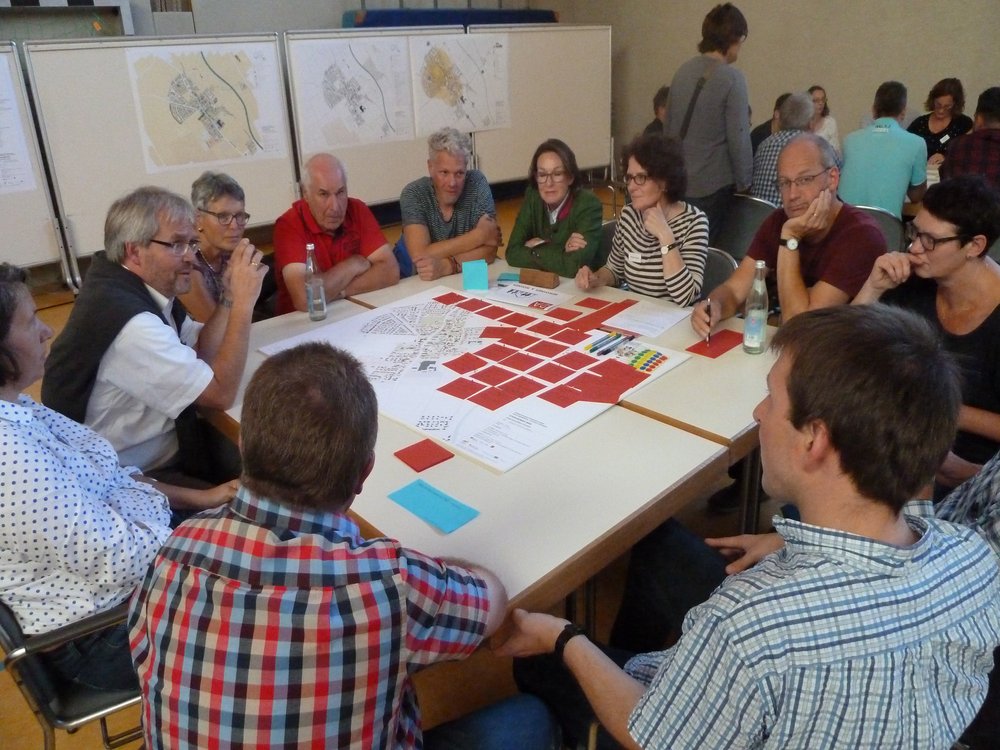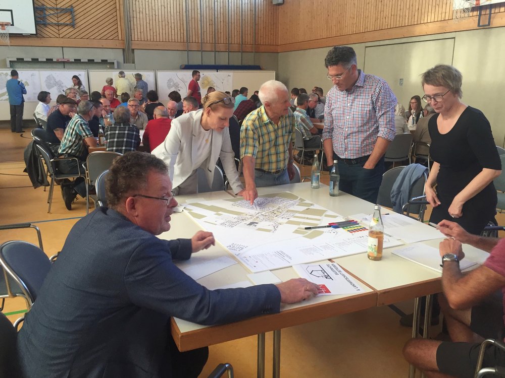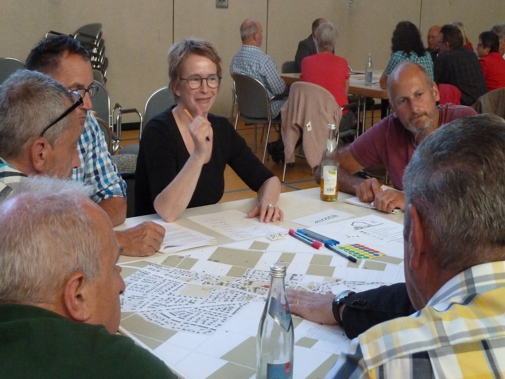 Den größten Zulauf hatten „Ortsbild & Zu Hause sein“, „Bewohner & Wohnen“ sowie „Versorgung & öffentliches Leben“, die offensichtlich eine hohe Bedeutung für die Steinheimer haben. Für „Mobilität & Unterwegs sein“ fanden sich dagegen weniger Interessenten als vermutet, das Thema wurde jedoch an den meisten anderen Tischen angeschnitten. Am kleinsten waren die Gruppen „Bauernhöfe & Landwirtschaft betreiben“ sowie „Gewerbe & Arbeiten“ – hier fühlte sich offenbar nur ein kleiner Kreis der anwesenden Personen im Saal persönlich betroffen. Die Frage nach der Zukunft alter Höfe wurde jedoch in allen Gruppen intensiv diskutiert.