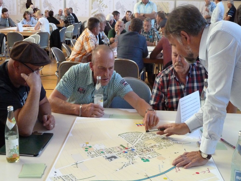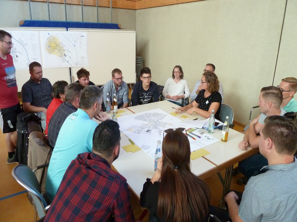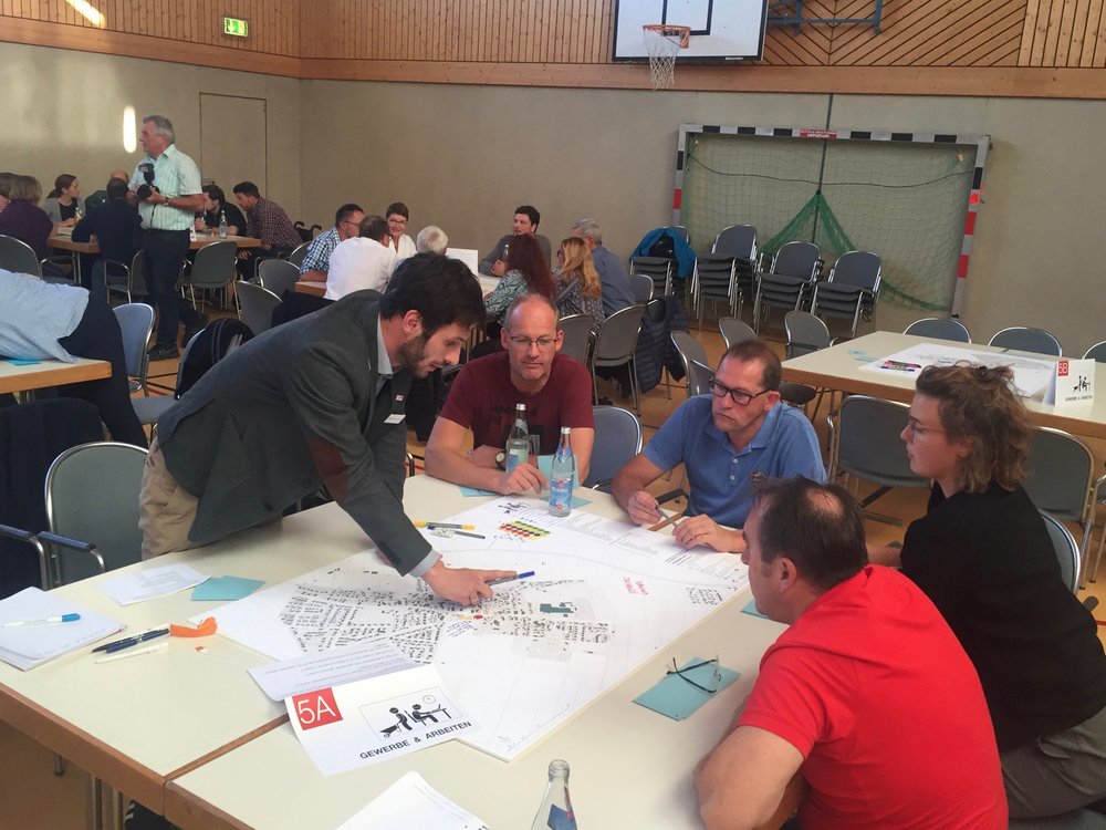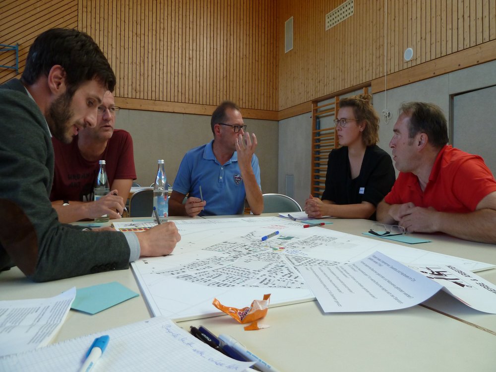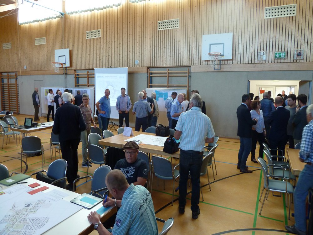 Den größten Zulauf hatten „Ortsbild & Zu Hause sein“, „Bewohner & Wohnen“ sowie „Versorgung & öffentliches Leben“, die offensichtlich eine hohe Bedeutung für die Steinheimer haben. Für „Mobilität & Unterwegs sein“ fanden sich dagegen weniger Interessenten als vermutet, das Thema wurde jedoch an den meisten anderen Tischen angeschnitten. Am kleinsten waren die Gruppen „Bauernhöfe & Landwirtschaft betreiben“ sowie „Gewerbe & Arbeiten“ – hier fühlte sich offenbar nur ein kleiner Kreis der anwesenden Personen im Saal persönlich betroffen. Die Frage nach der Zukunft alter Höfe wurde jedoch in allen Gruppen intensiv diskutiert.