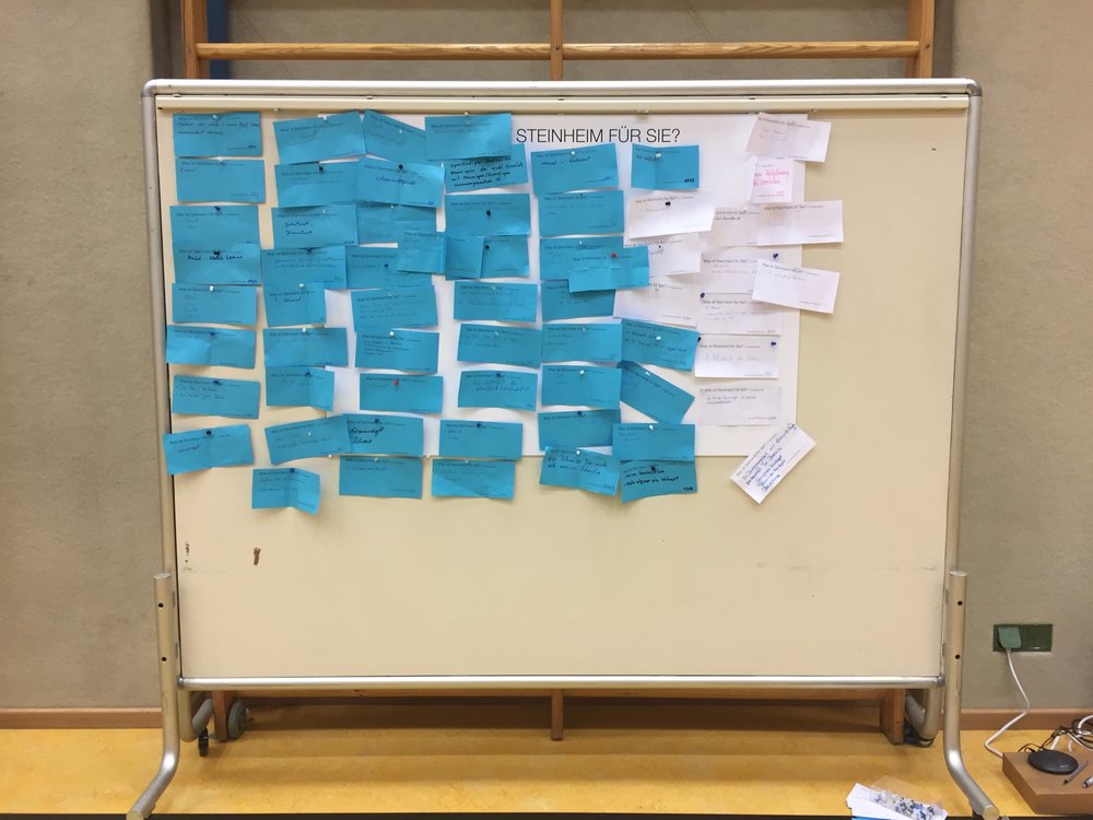 Gleich am Eingang der Halle wurde den Teilnehmenden die Frage gestellt: Empfinden Sie sich selbst als „zugezogen“ oder „alteingesessen“? Die Einschätzung hierüber oblag jedem Teilnehmer selbst. Doch egal, ob jemand den blauen Zettel für die „Alteingesessenen“ oder den weißen für die „Zugezogenen“ nahm, die Frage darauf war die gleiche: Was ist Steinheim für Sie?