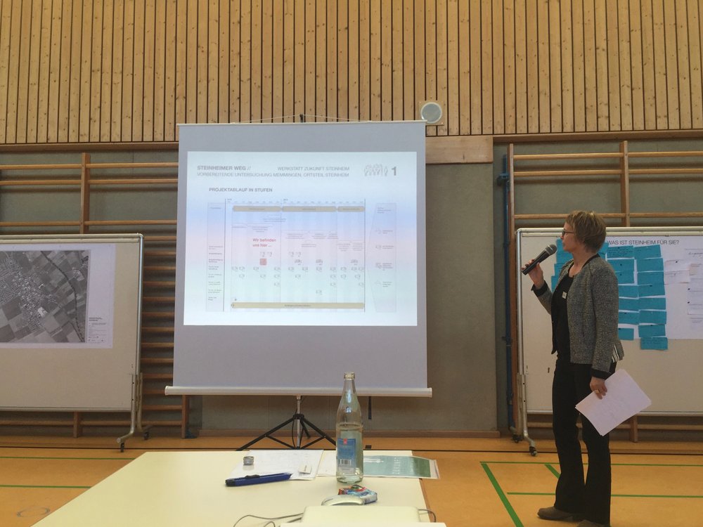 Am 12. Oktober 2018 fand auf Einladung des Oberbürgermeisters der Stadt Memmingen die erste Bürgerwerkstatt im Rahmen des Projekts statt. Etwa 120 Personen kamen am Nachmittag in die Turnhalle Steinheim, um über die Zukunft ihres Ortes zu diskutieren.