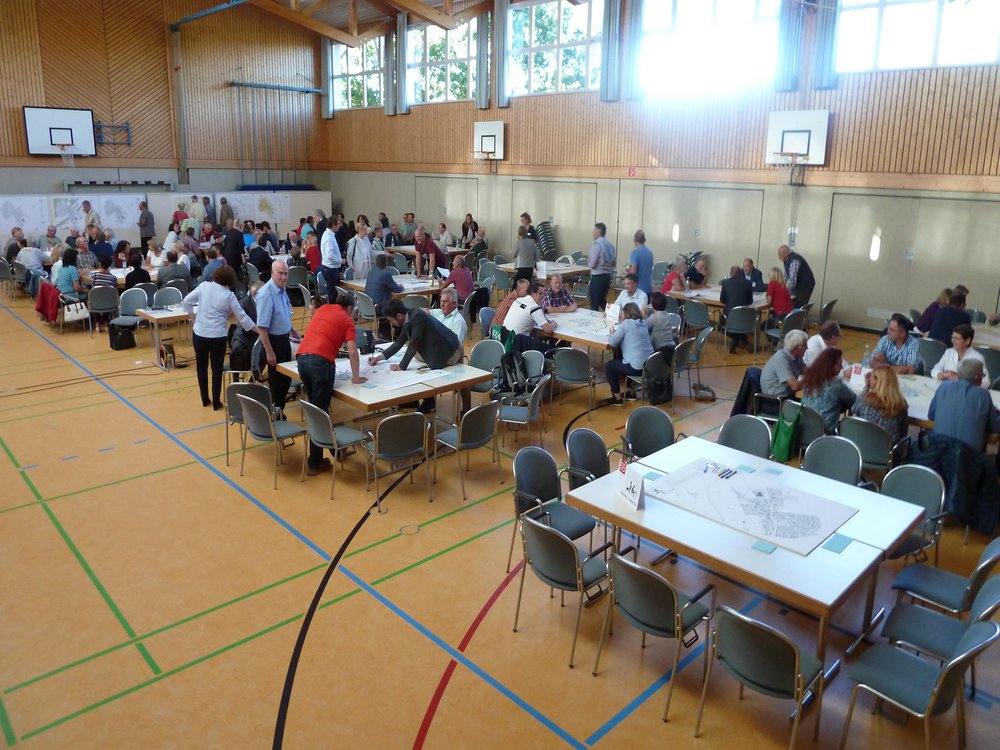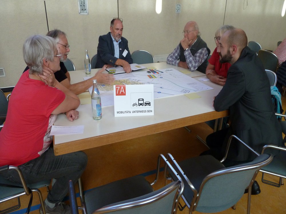 Die vorgestellten Thesen zu sieben Themenschwerpunkten wurden anschließend in kleineren Gruppen an zwölf Tischen diskutiert. Die Pläne zu den Themen hingen nicht nur an den Wänden aus, sondern dienten auch als Tischtafeln, welche die Bewohner*innen mit Notizen, Kritik und Vorschlägen beschreiben und bekleben konnten. Zeitlich gab es zwei Runden, ein Wechseln der Gruppen zwischendurch war möglich.
