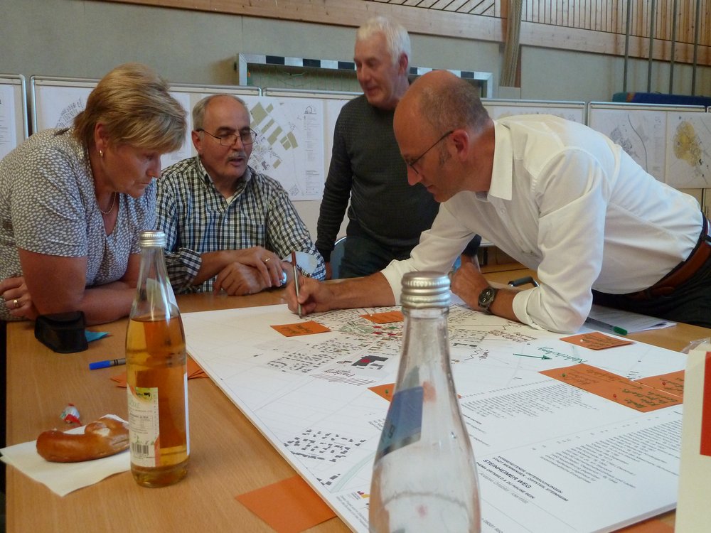 Die Thesen des Planerteams wurden an diesem Nachmittag in ihren Grundzügen bestätigt. „Steinheim soll Dorf bleiben“ war übergreifender Konsens. Dörfliche Strukturen und alte Höfe sollen erhalten werden, ebenso typisch dörfliche Nutzungen – lieber ein „Dorf in Nutzung statt ein Museumsdorf“, hieß es. Ein weiteres Wachstum wird akzeptiert und durchaus als Chance begriffen, z.B. für eine Wiedergewinnung der Ortsmitte als Treffpunkt und Versorgungsort.