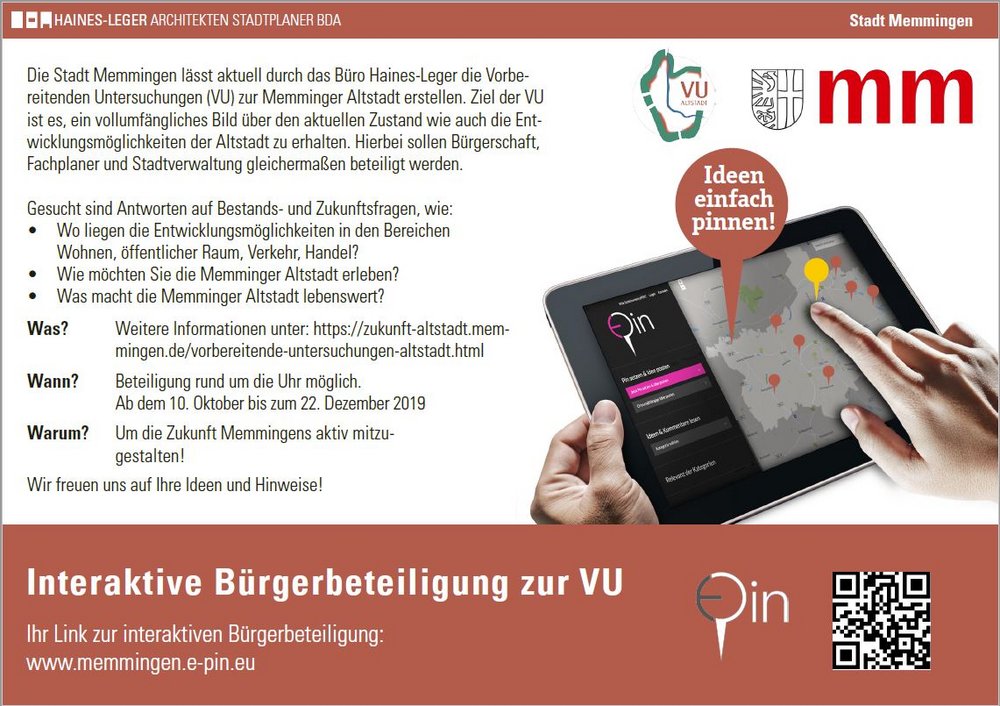Die Stadt Memmingen hat alle Interessierten eingeladen, diese virtuelle Bürgerwerkstatt unter www.rahmenplan-mm.e-pin.eu von 02. bis 23. Juli 2020 zu besuchen und sich an der Gestaltung des Rahmenplans der Memminger Altstadt zu beteiligen.