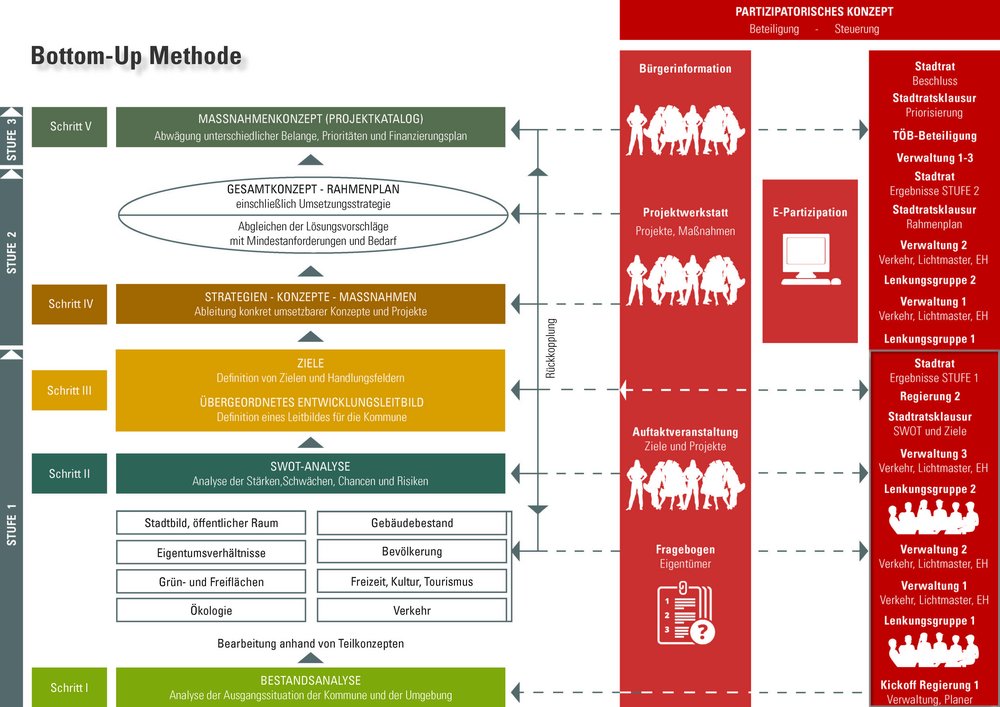 Im Rahmen von Stadtratsklausuren werden die Ergebnisse der einzelnen Stufen vorgestellt. Der Stadtrat hat die Möglichkeit, beispielsweise bei den Sanierungszielen, beim Rahmenkonzept und bei den Projektvorschlägen seine Prioritäten einzubringen.